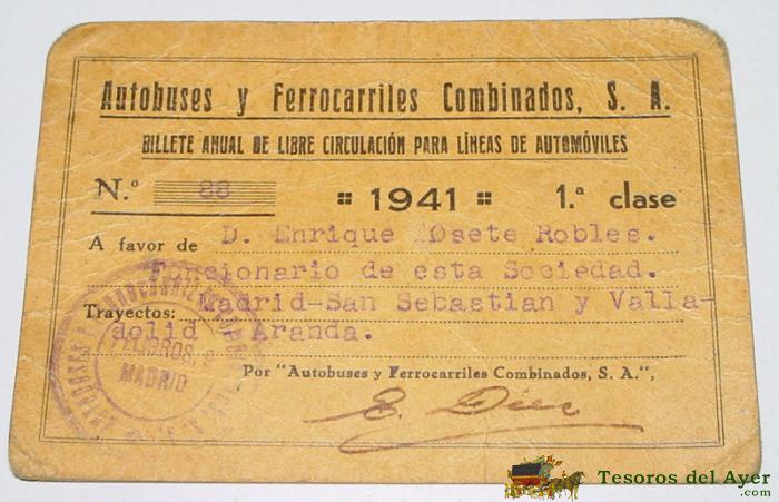 ANTIGUO CARNET AUTOBUSES Y FERROCARRILES COMBINADOS - BILLETE ANUAL DE LIBRE CIRCULACION - 1ª CLASE - AÑO 1941 - TREN - FERROCARRIL.