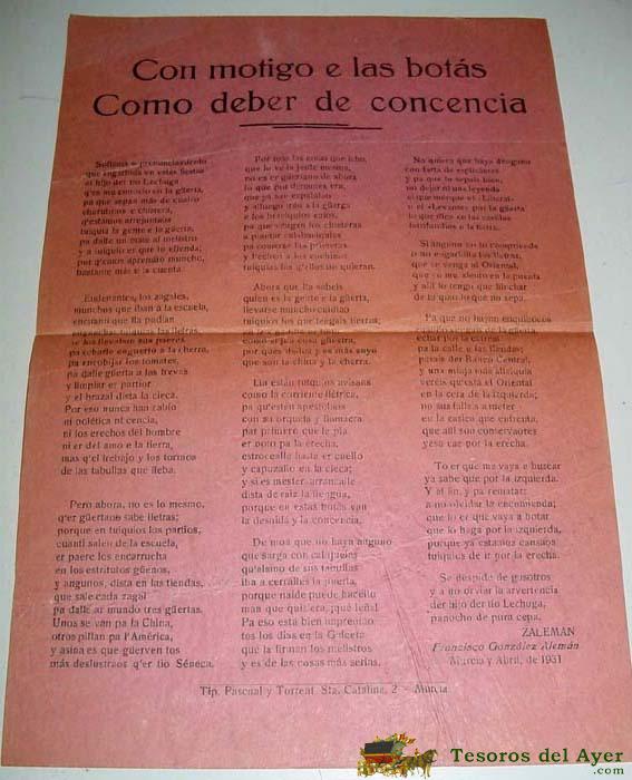 ANTIGUO FOLLETO MURCIANO 1931 - CON LENGUAJE HUERTANO - CARTEL . CON MOTIGO E LAS BOTAS . COMO DEBER DE CONCENCIA - TIP. PASCUAL Y TORRENT . MURCIA - MIDE 30,5 X 21 CMS.