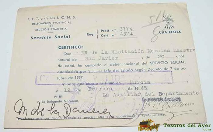SECCION FEMENINA, CERTIFICACION DE HABER CUMPLIDO EL DEBER NACIONAL DE SERVICIO SOCIAL, FALANGE ESPAÑOLA TRADICIONALISTA Y DE LAS JONS, 1945 - MIDE 14,5 X 10,5 CMS.