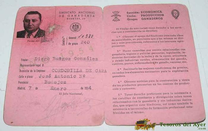 ANTIGUO CARNET DEL SINDICATO NACIONAL DE GANADERIA, DELEGACION NACIONAL DE SINDICATOS - 1954, TAL COMO SE VE EN LAS FOTOS.