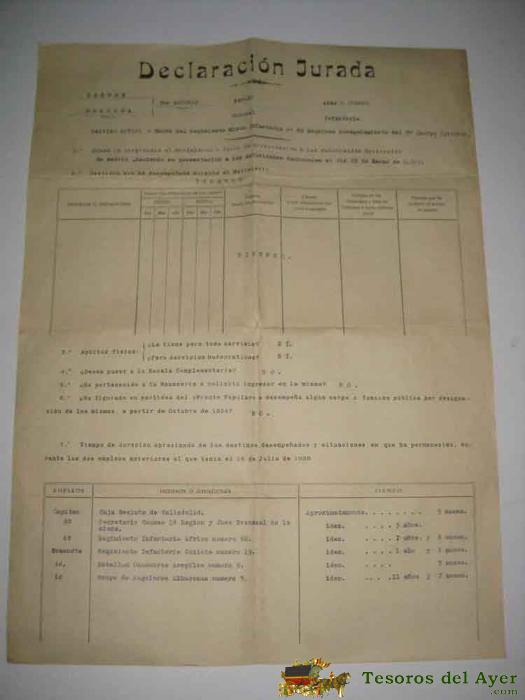 DECLARACION JURADA, HOJA DE SERVICIOS GUERRA CIVIL - DE CORONEL DE INFANTERIA EN 29 DE MARZO DE 1939, AL PRESENTARSE EN ZONA NACIONAL, DESPUES DE HABER ESTADO ESCONDIDO EN MADRID Y HABER SIDO LIBERADA. MUY INTERESANTE.