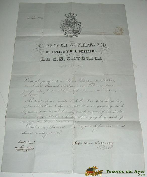 ANTIGUO PASAPORTE DE DE 1861, OTORGADO POR EL PRIMER SECRETYADO DE ESTADO Y DEL DESPACHO DE S.M CATOLICA A FAVOR DEL CONSUL DE ESPAÑA EN TETUAN PARA QUE PUEDA PASAR A TOMAR POSESION DE SU DESTINO. EN LA PARTE TRASERA LLEVA SELLO DEL CUERPO DE OCUPACION DE