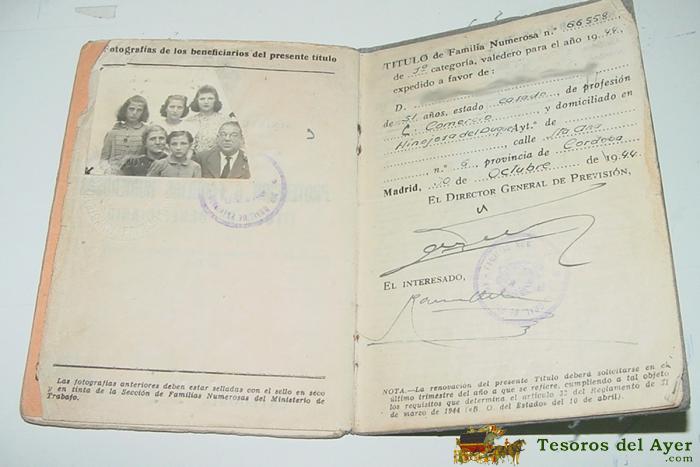 ANTIGUA CARTILLA O CARNET DE FAMILIA NUMEROSA EXPEDIDA POR EL MINISTERIO DE TRABAJO DEL AñO 1945 AUNQUE EN EL INTERIOR LLEVA TRES TARJETAS DE RENOVACIóN (1945/46 Y 47). - CON FOTOGRAFIA DE LA FAMILIA EN SU INTERIOR - MIDE 13,5 X 9,5 CMS.
