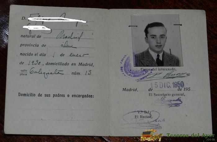 ANTIGUO CARNET O CARTA DE IDENTIDAD ESCOLAR DE LA UNIERSIDAD DE MADRID, FACULTAD DE CIENCIAS POLITICAS Y ECONOMICAS - CURSO 1950 A 1951 - MIDE DESPLEGADO 16 X 10,7 CMS.