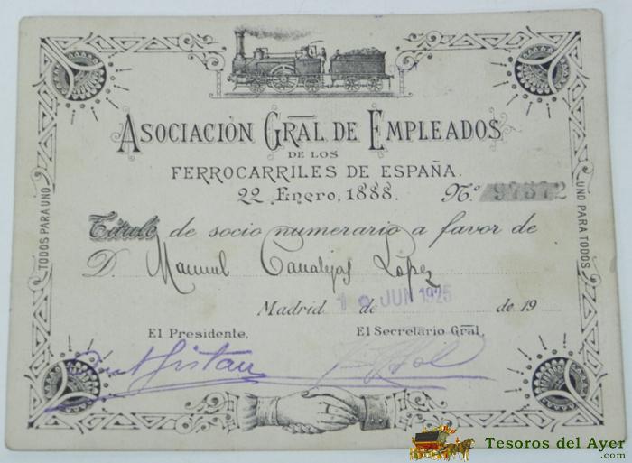 ANTIGUO TITULO DE LA ASOCIACION GRAL DE EMPLEADOS DE LOS FERROCARRILES DE ESPAÑA 22 ENERO 1888, TITULO DE SOCIO NUMERARIO, MADRID 1925. MIDE 14,5 X 11 CM, REVERSO CON SELLO EN AZUL DE ZONA DE MADRID.