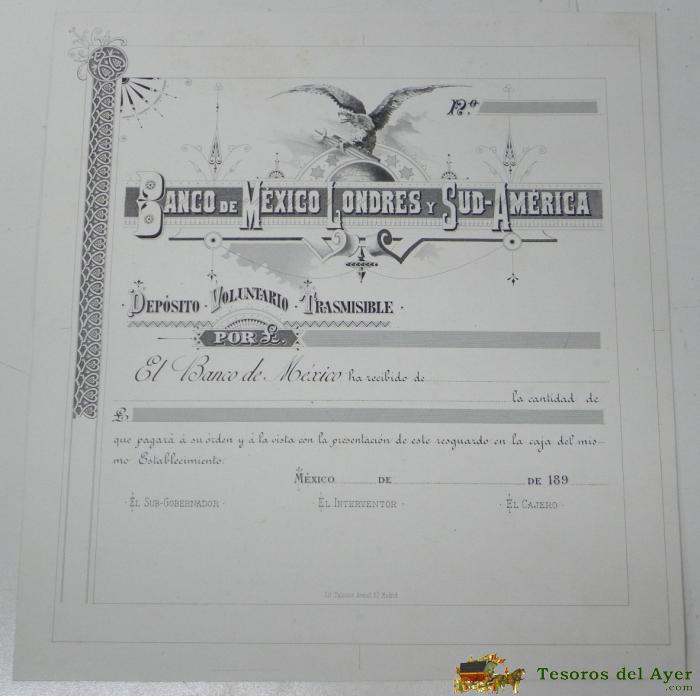 ANTIGUA LITOGRAFIA CON PUBLICIDAD DE BANCO DE MEXICO LONDRES Y SUD-AMERICA, MEXICO, TIPO ACCION, MIDE 24,,5 X 22,5 CMS.