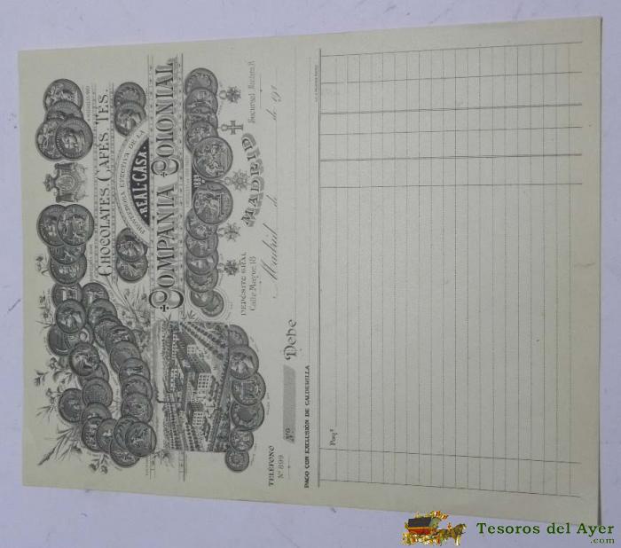 FACTURA CON GRAN ILUSTRACIÓN DE CHOCOLATES, CAFES Y TES - COMPAÑIA COLONIAL - AÑOS 1910 APROX - CASA FUNDADA EN 1854. MIDE 21 X 17,5 CMS.