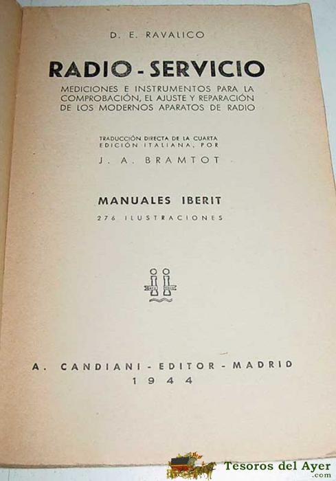 RADIO SERVICIO. MEDICIONES E INSTRUMENTOS PARA LA COMPROVACIóN, EL AJUSTE Y REPARACIóN DE LOS MODERNOS APARATOS DE RADIO. RAVALICO, D.E. - CANDIANI EDITOR 1944., MADRID MANUALES IBERIT., 1944. 19,5 CM. 316 P, 1 H CONTIENE UN TOTAL DE 276 ILUSTRACIONES: ES
