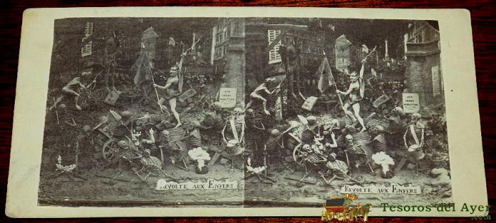 ANTIGUA FOTO ESTEREOSCOPICA DIABLERIES. ESTEREOSCOPIA DE DIABLERIES - REVOLTE AUX ENFERS, AUX ARMES DIABLOTINS, DIABLOS Y ESQUELETOS - MIDE 17 X 8,5 CMS. - INFIERNO, DIABLOS, SATAN - SIGLO XIX