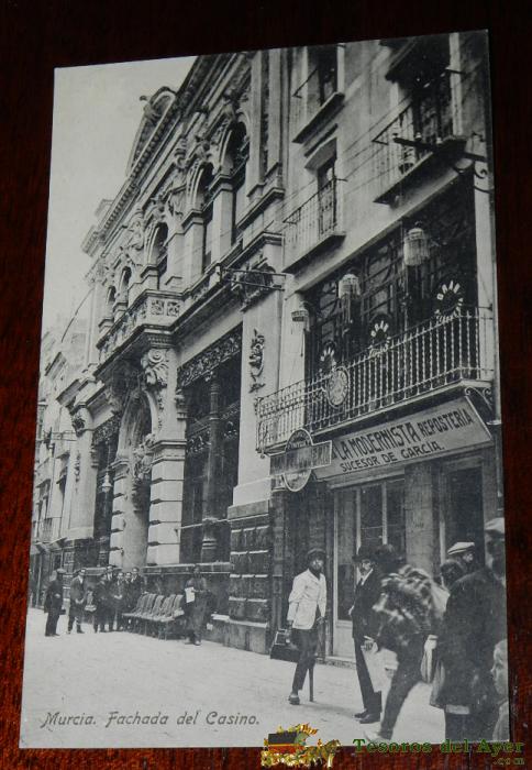 POSTAL DE MURCIA, FACHADA DEL CASINO, LA MODERNISTA REPOSTERIA, FABRICA DE POSTALES CASA REYES, NO CIRCULADA.