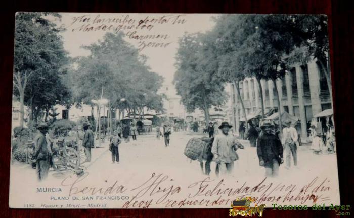 POSTAL DE MURCIA, PLANO DE SAN FRANCISCO, N. 1183 HAUSER Y MENET, CIRCULADA, ESCRITA, SIN DIVIDIR.