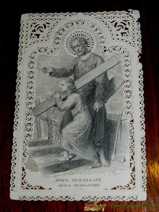ANTIGUA ESTAMPA CALADA RELIGIOSA DE JESUS TRABAJANDO, FINALES DEL SIGLO XIX, MIDE 11,3 X 7,2 CMS. BUEN ESTADO.
