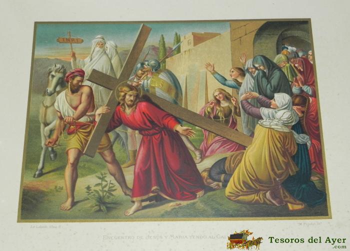 ANTIGUA LITOGRAFIA DEL ENCUENTRO DE JESUS Y MARIA YENDO AL CALVARIO, LITOGRAFIA LABIELLE, M. PUJADAS, PRECIOSA MIDE 38,5 X 27,5 CMS.