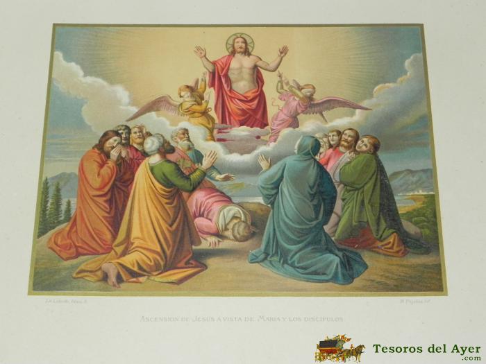ANTIGUA LITOGRAFIA DE LA ASCENSION DE JESUS A VISTA DE MARIA Y LOS DISCIPULOS, LITOGRAFIA LABIELLE, M. PUJADAS, PRECIOSA MIDE 38,5 X 27,5 CMS.