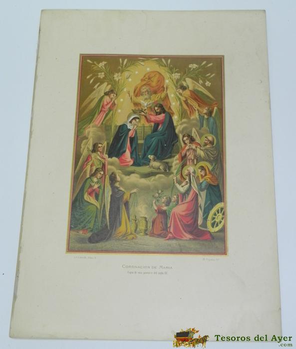 ANTIGUA LITOGRAFIA DE LA CORONACION DE MARIA, COPIA DE UNA PINTURA DEL SIGLO XV, LITOGRAFIA LABIELLE, M. PUJADAS, PRECIOSA MIDE 38,5 X 27,5 CMS.