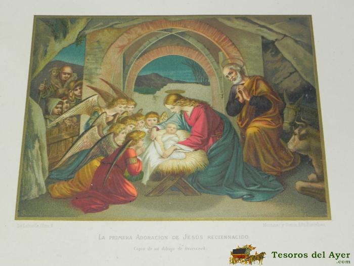 ANTIGUA LITOGRAFIA DE LA PRIMERA ADRACION DE JESUS RECIEN NACIDO, COPIA DE UN DIBUJO DE OVERWECK, LITOGRAFIA LABIELLE, MONTANER Y SIMON EDIT., PRECIOSA MIDE 38,5 X 27,5 CMS.