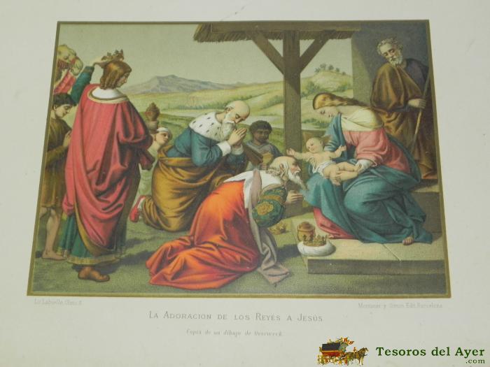 ANTIGUA LITOGRAFIA DE LA ADORACION DE LOS REYES A JESUS, COPIA DE UN DIBUJO DE OVERWECK, LITOGRAFIA LABIELLE, M. MONTANER Y SIMON, PRECIOSA MIDE 38,5 X 27,5 CMS.