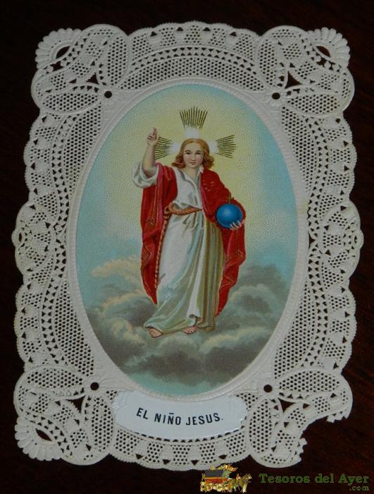 ANTIGUA ESTAMPA BORDADA Y CALADA RELIGIOSA DE EL NIÑO JESUS, FINALES DEL SIGLO XIX, MIDE 5,5 X 7,5 CMS. BUEN ESTADO.