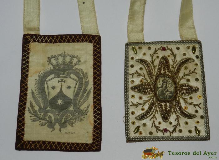 ANTIGUO RELICARIO CON FILIGRANA DE ORO BORDADO, ASOCIACION DE NUESTRA SEÑORA DEL CARMEN, MIDE CADA CUADRO 9,5 X 7,5 CMS. EN TELA.