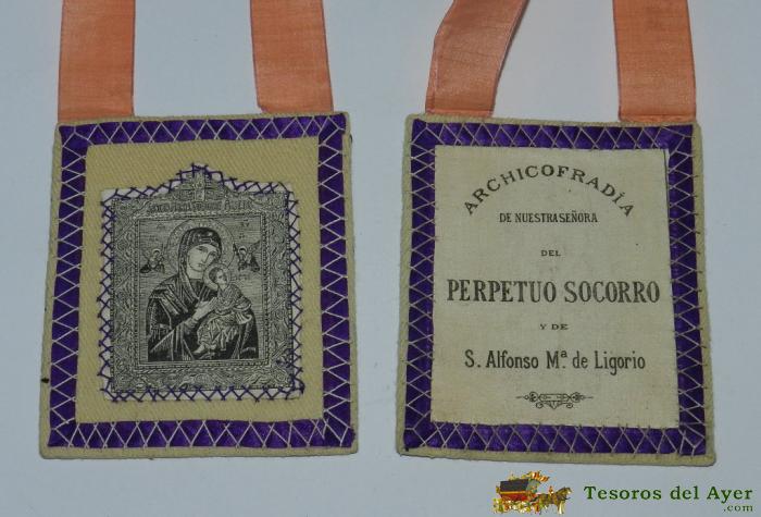 ANTIGUO RELICARIO DE LA ARCHICOFRADIA DE NUESTRA SEÑORA DEL PERPETUO SOCORRO, Y DE S. ALFONSO MARIA DE LIGORIO, MIDE CADA CUADRO 9,5 X 8 CMS. DE TELA.