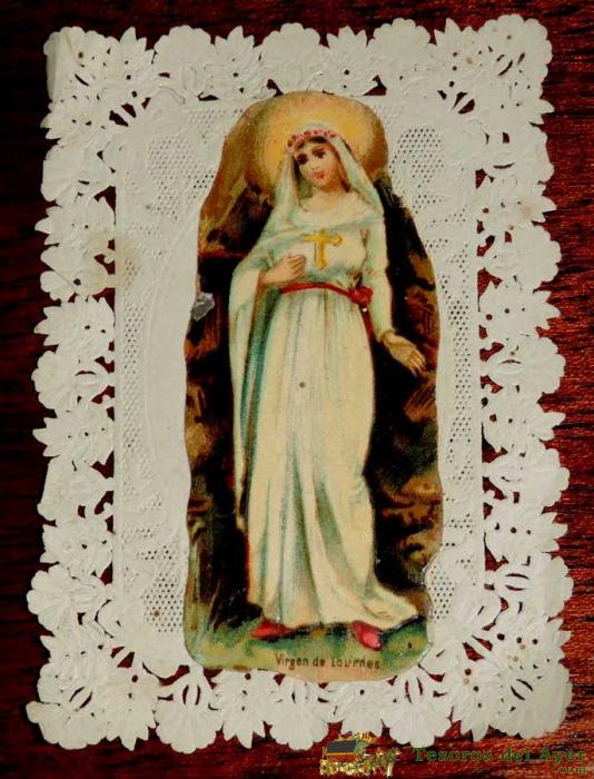 ANTIGUA ESTAMPA SAGRADA RELIGIOSA CALADA DE LA VIRGEN DE LOURDES, CON PUBLICIDAD DE FABRICA DE CHOCOLATES LA ESPAÑA - BUEN ESTADO - MIDE 10,2 X 7CMS. ESTAMPA BORDADA, CALADA,