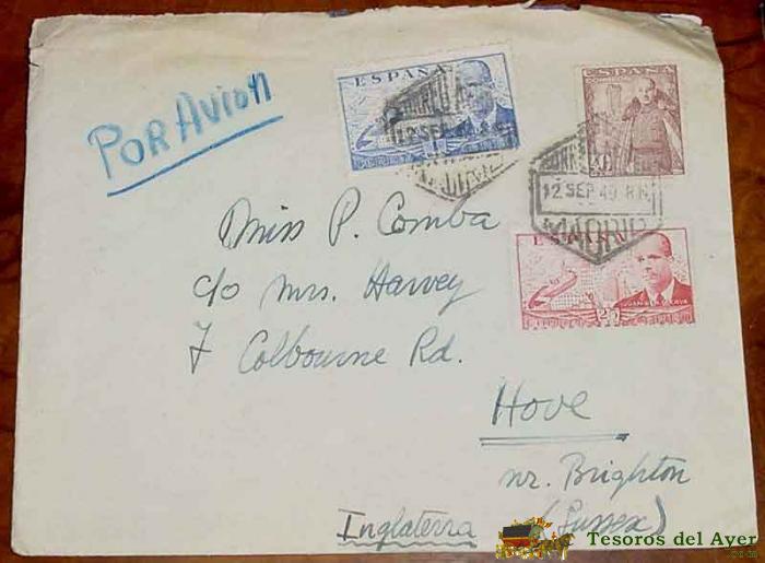ANTIGUO SOBRE CIRCULADO POR AVION DESDE MADRID A HOVE (REINO UNIDO) EL 12 DE SEPTIEMBRE DE 1949 - HISTORIA POSTAL, TAL COMO SE VE EN LAS FOTOS, BUEN ESTADO DE CONSERVACION
