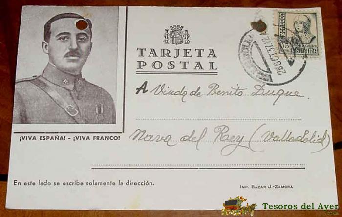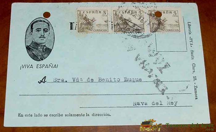 ANTIGUA TARJETA PSTAL PATRIOTICA, FRANCO, GUERRA CIVIL, CON SELLO DE CENSURA MILITAR DE ZAMORA - CIRCULADA EN 1937 - TIENE DOS AGUJERITOS POR HABER ESTADO EN UN ARCHIVADOR - ALGUN DETERIORO
