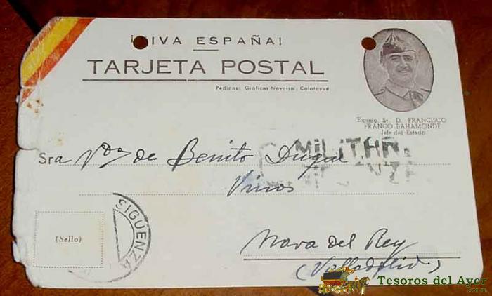 ANTIGUA TARJETA PSTAL PATRIOTICA, FRANCO, GUERRA CIVIL, CON SELLO DE CENSURA MILITAR DE SIGUENZA - CIRCULADA EN 1937 - TIENE DOS AGUJERITOS POR HABER ESTADO EN UN ARCHIVADOR