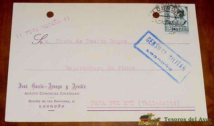 ANTIGUA TARJETA POSTAL GUERRA CIVIL, CON SELLO DE CENSURA MILITAR DE LOGROÑO - CIRCULADA EN 1937 - TIENE DOS AGUJERITOS POR HABER ESTADO EN UN ARCHIVADOR - ALGUN DETERIORO