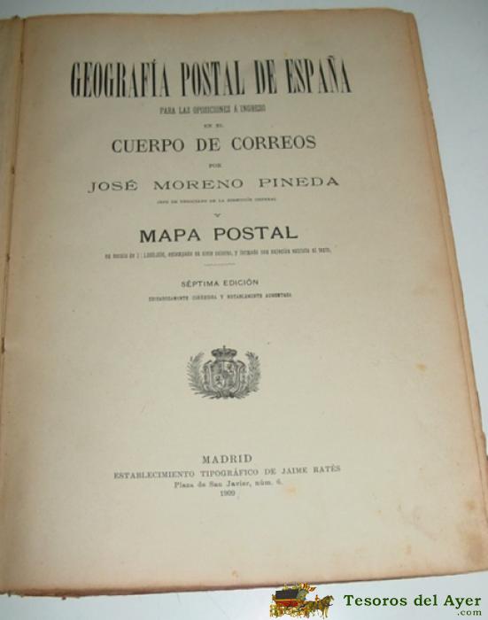 MORENO PINEDA, GEOGRAFIA POSTAL DE ESPAÑA PARA LAS OPOSICIONES A INGRESO EN EL CUERPO DE CORREOS Y MAPA POSTAL, 7 EDICION, MADRID ESTABLECIMIENTO TIPOGRAFICO DE JAIME RATES, 1909, 208 PAG, RUSTICA, LE FALTA EL MAPA POSTAL - TAL COMO SE VE EN LAS FOTOS, MU