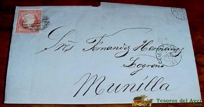 ESPAÑA. . 4 CTOS. , MAT. VALLADOLID OCTUBRE 1857 - MUY RARO EL TIPO III EN CARTA Y CON FECHADOR. MAGNÍFICA. A LOGROÑO - MUNILLA - HISTORIA POSTAL