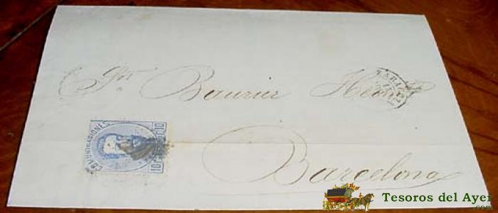 SOBRE CIRCULADO - ESPAÑA. .10 CTS. . , MAT. ZARAGOZA 1873 - MUY RARO CON FECHADOR. MAGNÍFICA. A BARCELONA - HISTORIA POSTAL