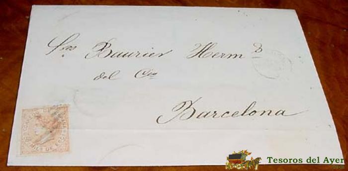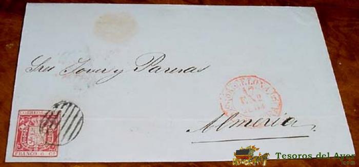 SOBRE CIRCULADO - ESPAÑA. CORREOS 1854 FRANCO 6 CS. , MAT. BARCELONA 1854 - MUY RARO CON FECHADOR. MAGNÍFICA. A ALMERIA - HISTORIA POSTAL