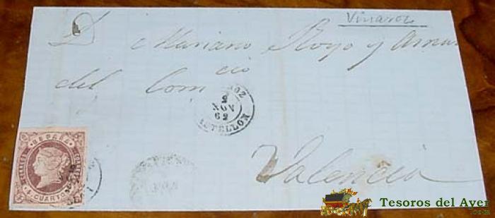 SOBRE CIRCULADO - ESPAÑA. CORREOS 1862 - 4 CUARTOS COMUNICACIONES - MATASELLOS FECHADOR 1862 VINAROZ (CASTELLON) A VALENCIA - HISTORIA POSTAL