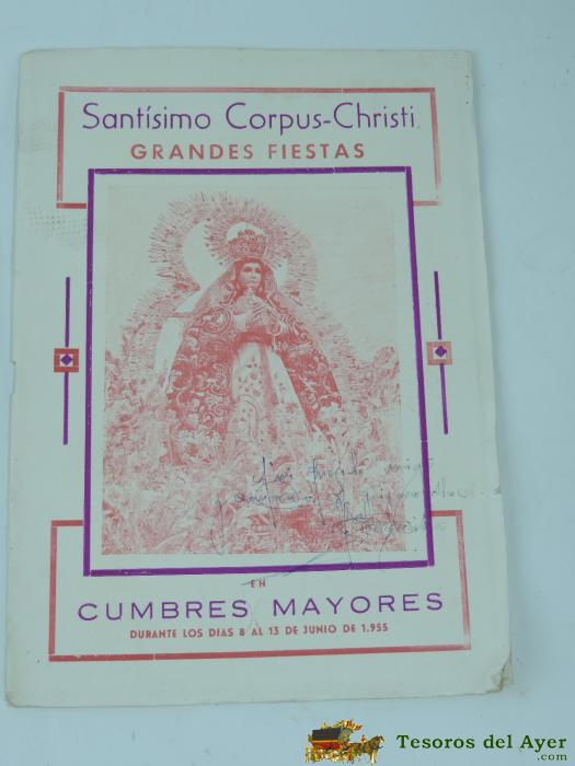 CATALOGO DE LAS FIESTAS DE CUMBRES MAYORES. HUELVA. SANTISIMO CORPUS CHRISTI. LA FALANGE EN CUMBRE MAYORES (REPORTAJE). DEL 8 AL 13 DE JUNIO DE 1955, TIENE 16 PAG. CON DEDICATORIA EN LA PORTADA.