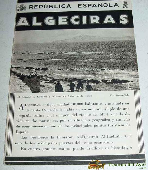 ANTIGUO FOLLETO-GUIA DE LA REPUBLICA ESPAÑOLA - ALGECIRAS - 16 PAGINAS, FOTOS DEL ESTRECHO, TARIFA MIDE 12X17 APROXMTE DEL PATROANTO NACIONAL DE TURISMO HUECOGRABADO MUMBRU IMPRESO EN ESPAÑA, DETRAS EL MAPA DE LA EPOCA DE LA CIUDAD DE ALGECIRAS.