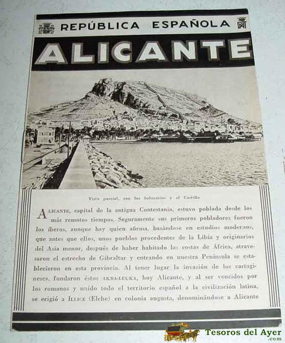 ANTIGUO FOLLETO-GUIA DE LA REPUBLICA ESPAÑOLA - ALICANTE - 8 PAGINAS, FOTOS DE ALICANTE Y ELCHE - MIDE 12X17 APROXMTE DEL PATROANTO NACIONAL DE TURISMO HUECOGRABADO MUMBRU IMPRESO EN ESPAÑA, DETRAS EL MAPA DE LA EPOCA DE LA CIUDAD DE ALICANTE.