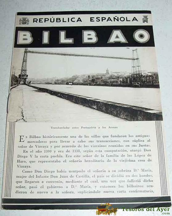 ANTIGUO FOLLETO-GUIA DE LA REPUBLICA ESPAÑOLA - BILBAO - FOTOS DE PORTUGALETE Y BILBAO - 8 PAGINAS - MIDE 12X17 APROX. DEL PATROANTO NACIONAL DE TURISMO HUECOGRABADO MUMBRU IMPRESO EN ESPAÑA, DETRAS EL MAPA DE LA EPOCA DE LA CIUDAD DE BILBAO.