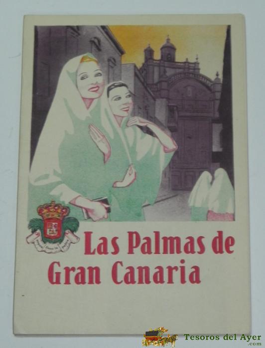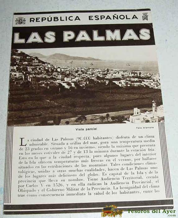 ANTIGUO FOLLETO-GUIA DE LA REPUBLICA ESPAÑOLA - LAS PALMAS - 8 PAGINAS - MIDE 12X17 APROX. DEL PATRONATO NACIONAL DE TURISMO HUECOGRABADO MUMBRU IMPRESO EN ESPAÑA, DETRAS EL MAPA DE LA EPOCA DE CARRETERAS DE GRAN CANARIA.