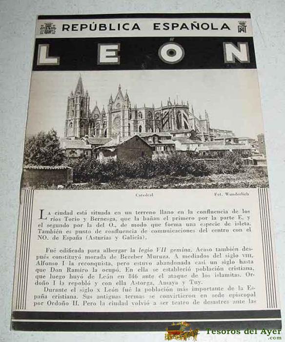 ANTIGUO FOLLETO-GUIA DE LA REPUBLICA ESPAÑOLA - LEON - 8 PAGINAS - MIDE 12X17 APROX. DEL PATRONATO NACIONAL DE TURISMO HUECOGRABADO MUMBRU IMPRESO EN ESPAÑA, DETRAS EL MAPA DE EPOCA DE LA CIUDAD DE LEON.