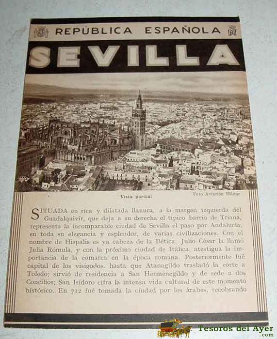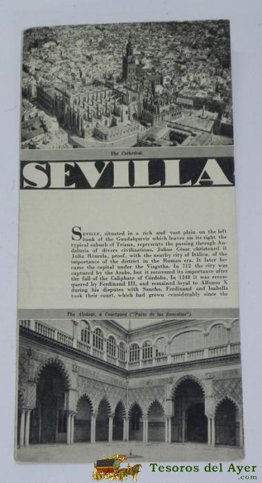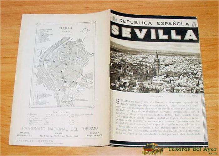 ANTIGUO FOLLETO-GUIA DE LA REPUBLICA ESPAÑOLA - SEVILLA - 8 PAGINAS - MIDE 12X17 APROX. DEL PATRONATO NACIONAL DE TURISMO HUECOGRABADO MUMBRU IMPRESO EN ESPAÑA, DETRAS EL MAPA DE EPOCA DE LA CIUDAD DE SEVILLA.