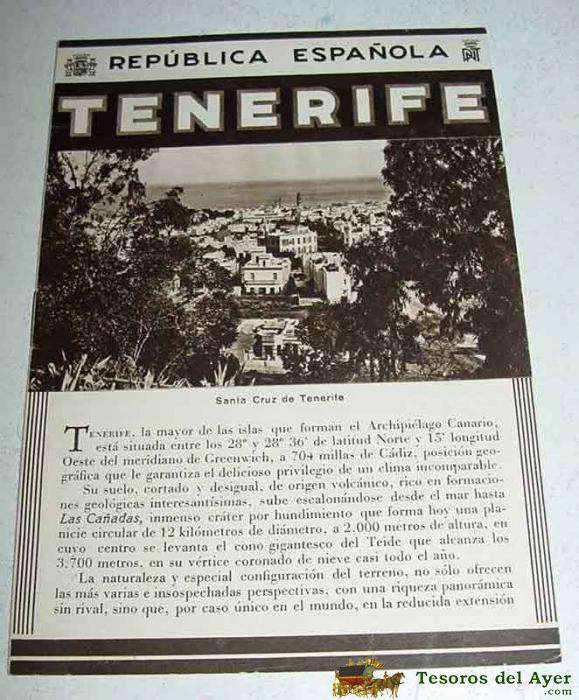 ANTIGUO FOLLETO-GUIA DE LA REPUBLICA ESPAÑOLA - TENERIFE - 8 PAGINAS - MIDE 12X17 APROX. DEL PATRONATO NACIONAL DE TURISMO HUECOGRABADO MUMBRU IMPRESO EN ESPAÑA, DETRAS EL MAPA DE EPOCA DE LA CIUDAD SANTA CRUZ DE TENERIFE.