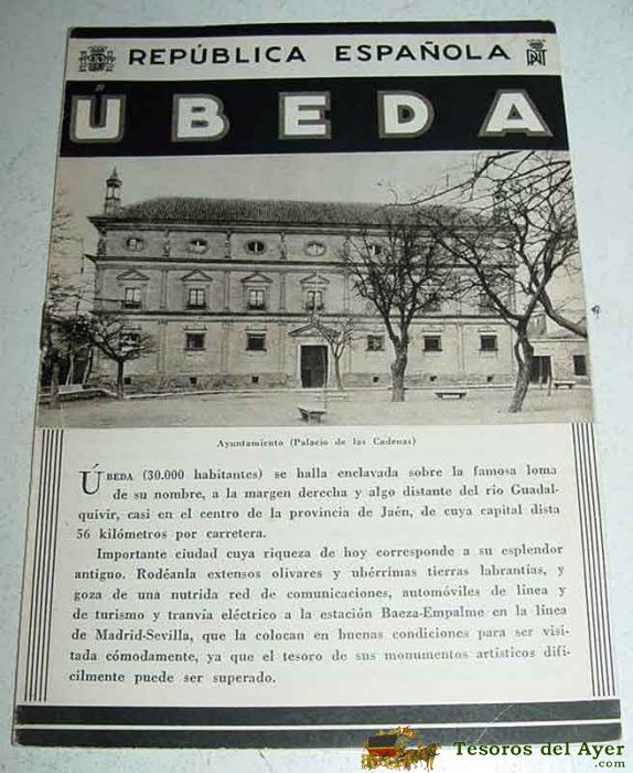 ANTIGUO FOLLETO-GUIA DE LA REPUBLICA ESPAÑOLA - UBEDA - 8 PAGINAS - MIDE 12X17 APROX. DEL PATRONATO NACIONAL DE TURISMO HUECOGRABADO MUMBRU IMPRESO EN ESPAÑA, DETRAS EL MAPA DE EPOCA DE LA CIUDAD UBEDA.