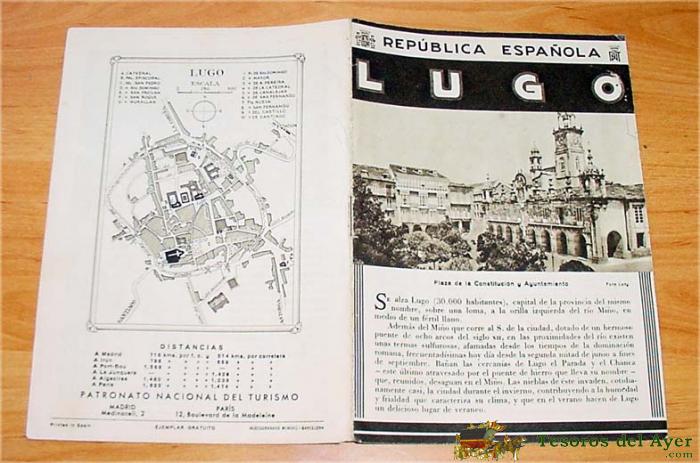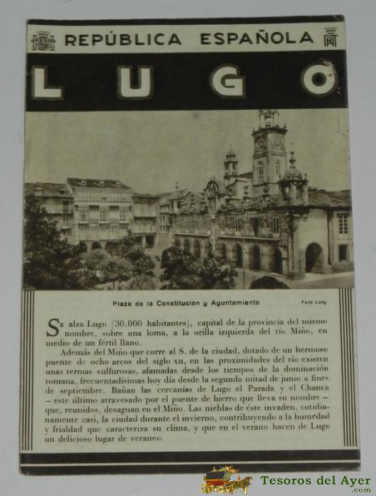 FOLLETO-GUIA DE LA REPUBLICA ESPAÑOLA - LUGO - CONSTA DE 4 HOJAS - 8 PAGINAS, FOTOS DE CAVALLOS DE SAMOY Y DE ARRAUNA, MIDE 12X17 APROXMTE DEL PATROANTO NACIONAL DE TURISMO HUECOGRABADO MUMBRU IMPRESO EN ESPAÑA, DETRAS EL MAPA DE LA EPOCA DE LA CIUDAD DE