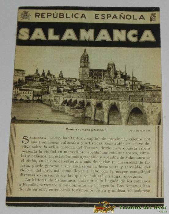 ANTIGUO FOLLETO-GUIA DE LA REPUBLICA ESPAÑOLA - SALAMANCA - 8 PAGINAS - MIDE 12X17 APROX. DEL PATRONATO NACIONAL DE TURISMO HUECOGRABADO MUMBRU IMPRESO EN ESPAÑA, DETRAS EL MAPA DE EPOCA DE LA CIUDAD DE PALMA DE SALAMANCA.
