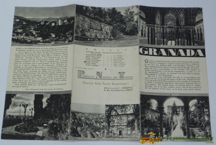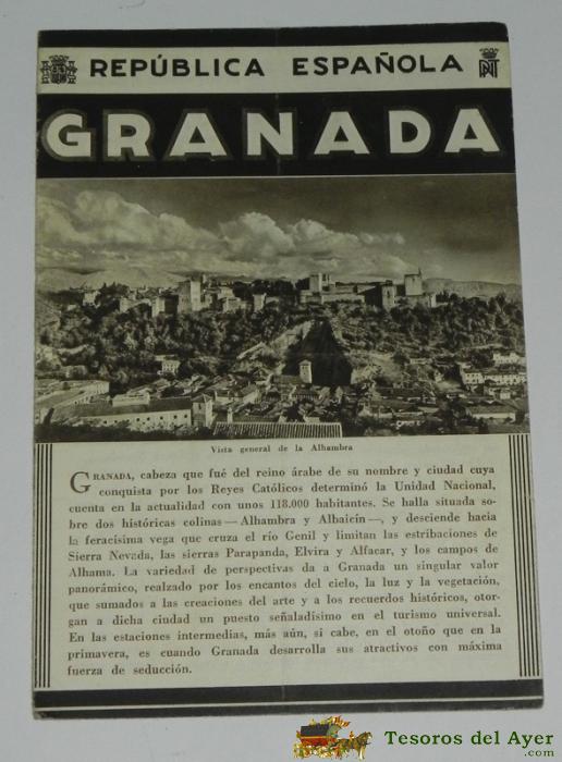 FOLLETO-GUIA DE LA REPUBLICA ESPAÑOLA - GRANADA - CONSTA DE 4 HOJAS - 8 PAGINAS, , MIDE 12 X 17 CMS, APROXMTE DEL PATRONATO NACIONAL DE TURISMO HUECOGRABADO MUMBRU IMPRESO EN ESPAÑA, DETRAS EL MAPA DE LA EPOCA DE LA CIUDAD DE GRANADA.