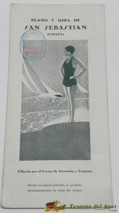 ANTIGUO PLANO Y GUIA DE SAN SEBASTIAN - MUY INTERESANTE, CON SELLO DE LA REPUBLICA, GRAN CANTIDAD DE FOTOGRAFIAS - FORMATO DESPLEGADO 70 X 50 CMS.