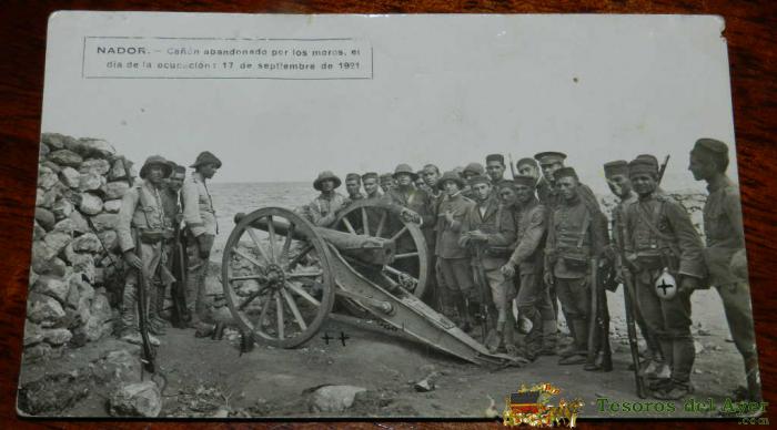 ANTIGUA FOTO POSTAL DE NADOR, GUERRA DEL RIF, CAÑON ABANDONADO POR LOS MOROS, ESCRITA, NO CIRCULADA.