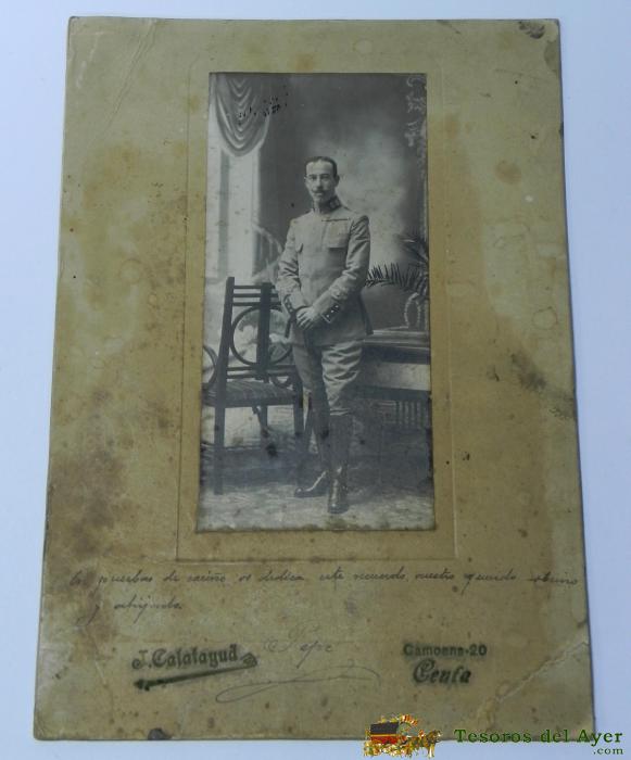 ANTIGUA FOTOGRAFIA ALBUMINA DE TENIENTE DE REGIMIENTO NUM. 69, FOTO CALATAYUD, CEUTA, CON DEDICATORIA Y FIRMA MANUSCRITA, AÑO 1910 APROX., MIDE 27 X 19 CMS.