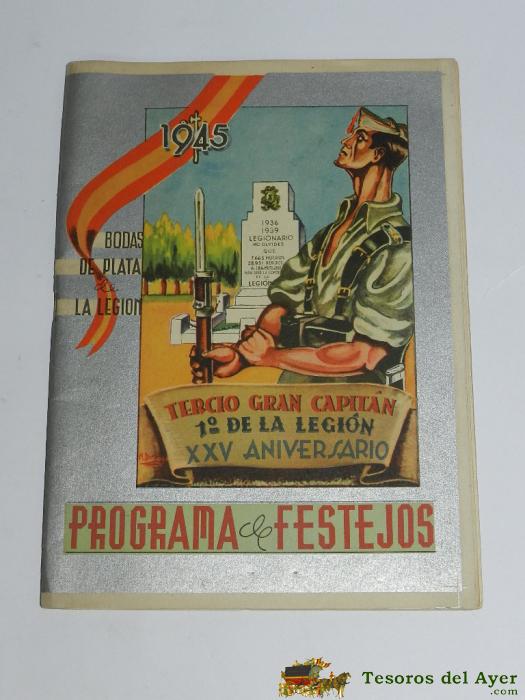 ANTIGUO PROGRAMA DE FESTEJO DE LA LEGION, BODAS DE PLATA DE LA LEGION, TERCIO GRAN CAPITAN, 1º DE LA LEGION, XXV ANIVERSARIO, 1945, TIENE 32 PAGINAS INCLUYENDO LAS TAPAS, MIDE 22 X 16 CMS. EXCELENTE ESTADO DE CONSERVACION,